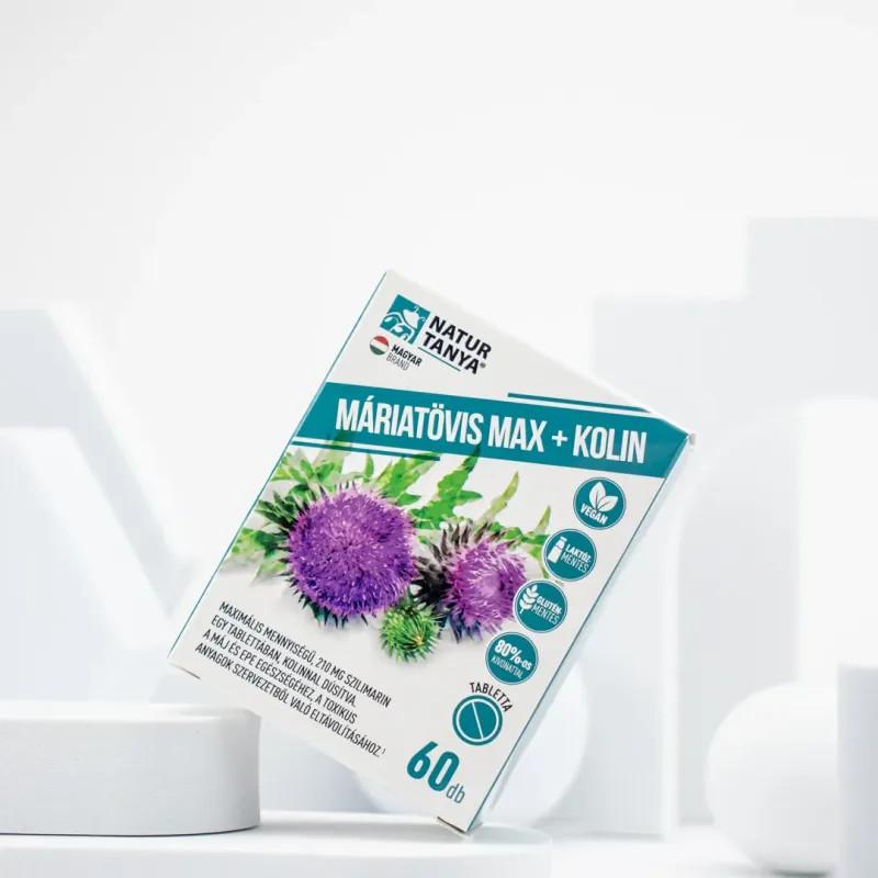 A Natur Tanya® MÁRIATÖVIS MAX + KOLIN a máj és epe egészségét támogató, magas hatóanyag-tartalmú étrend-kiegészítő, mely a megengedett legnagyobb mennyiségben (210 mg) tartalmazza a máriatövis mag kivonat aktív összetevőjét, a szilimarint, kolinnal kiegészítve.